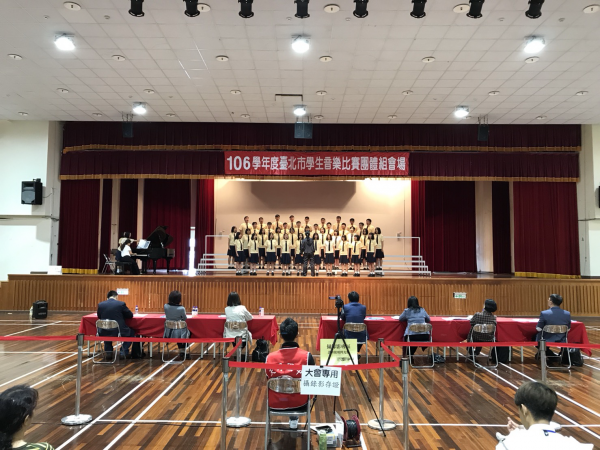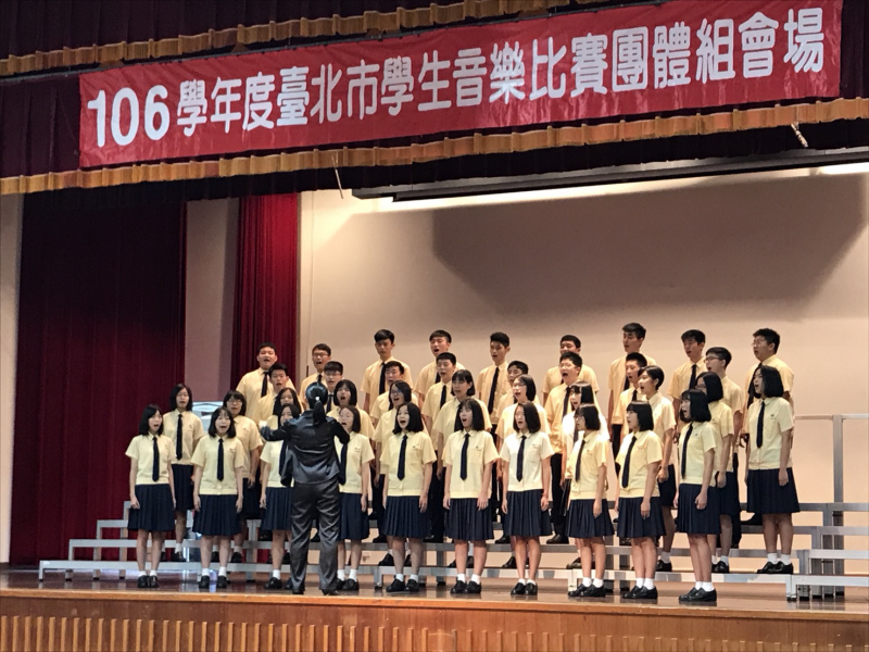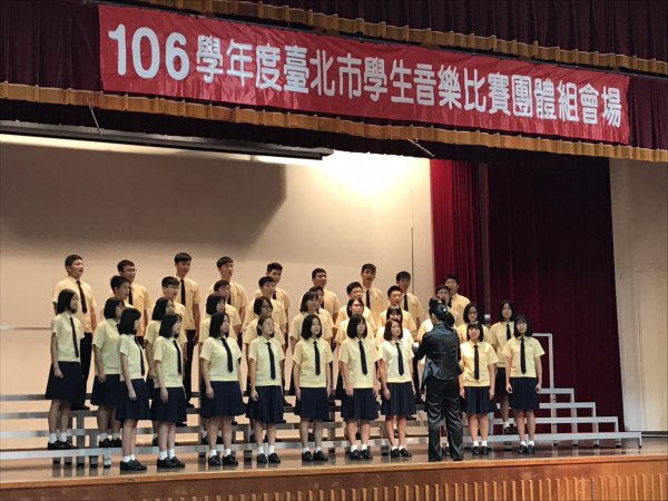 本校合唱團於106年10月20日(五)中午前往臺北市立天母國中參加「106學年度臺北市學生音樂比賽」高中職組混聲合唱比賽。同學們在李璧如老師及曾惠君老師的指導之下,經過長時間的準備與練習,最後榮獲臺北市南區第一名。賽後,校長聞訊後亦訂購精美餐點獎勵同學,期許同學在全國賽再創佳績。